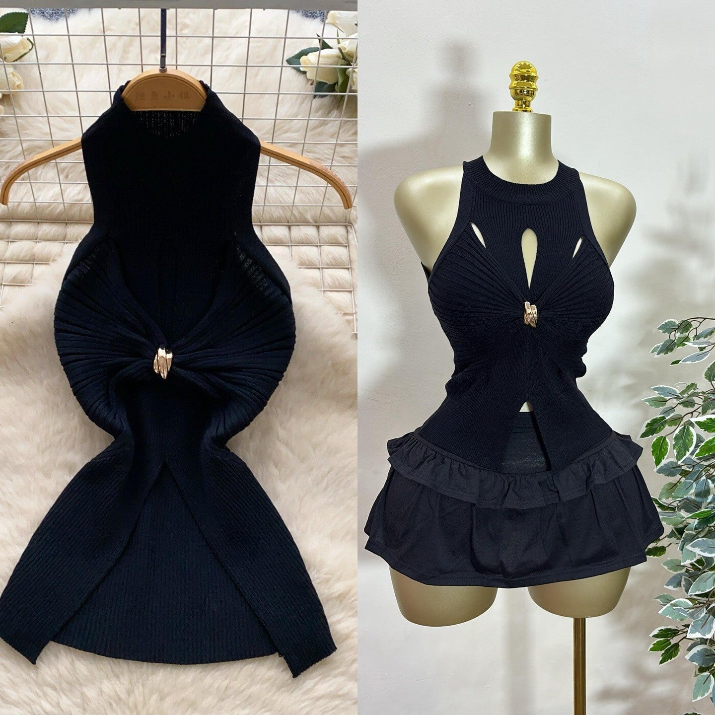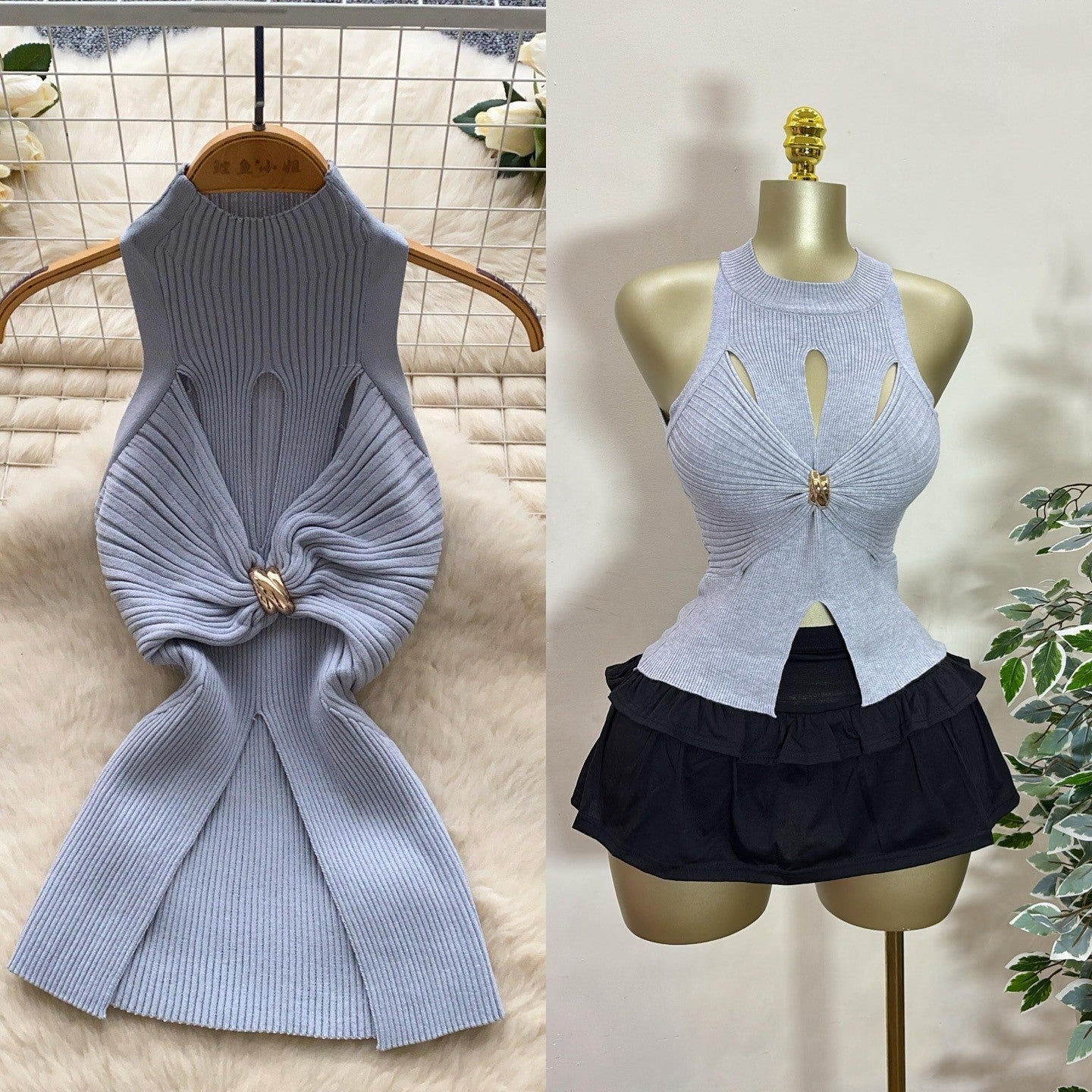 The Novara Knit Metal Accent Top is a bold, fashion-forward piece with a sleek silhouette. Designed in a slim fit with sleeveless styling, it features metallic twisted details that add a statement edge to evening looks.
